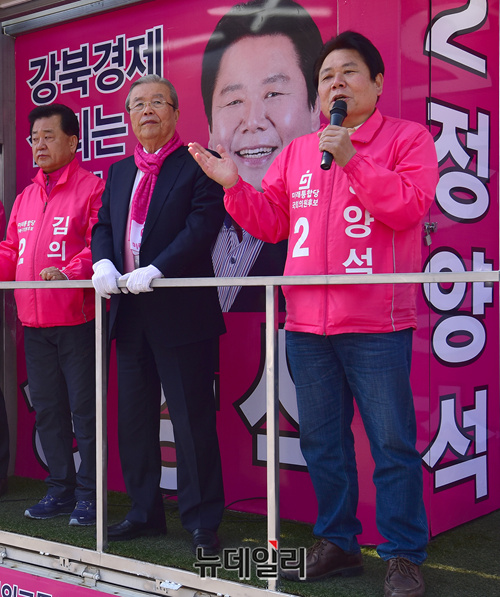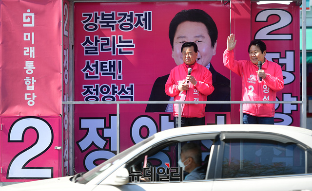 정양석 미래통합당 강북갑 국회의원 후보(오른쪽부터), 김종인 총괄선대위원장, 김의경 강북구의원 후보가 9일 오전 서울 강북구 수유리먹자골목 인근에서 유세차량에 올라 지지를 호소하고 있다.