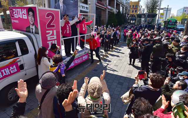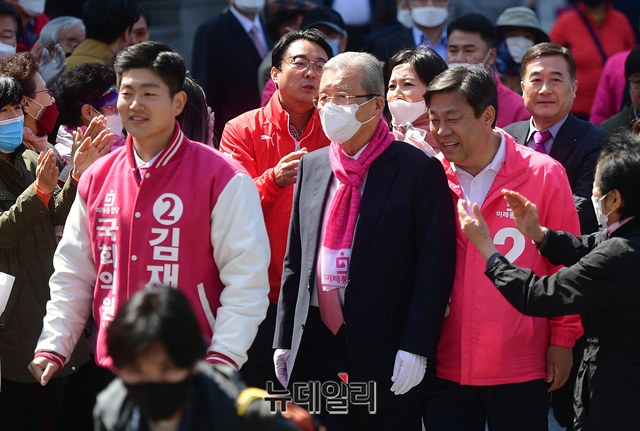 김종인 미래통합당 총괄선대위원장이 9일 오전 서울 도봉구 쌍문역 인근에서 열린 도봉구 후보 지원유세에 참석해 지지자들에게 박수를 받으며 유세차량으로 이동하고 있다.