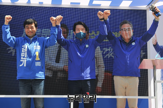 이인영 더불어민주당 공동선대위원장이 9일 오후 경기 용인시 기흥구청에서 김민기 용인을 후보와 유세차량에 올라 지지호소를 하고 있다. (경기 용인=권창회 기자)