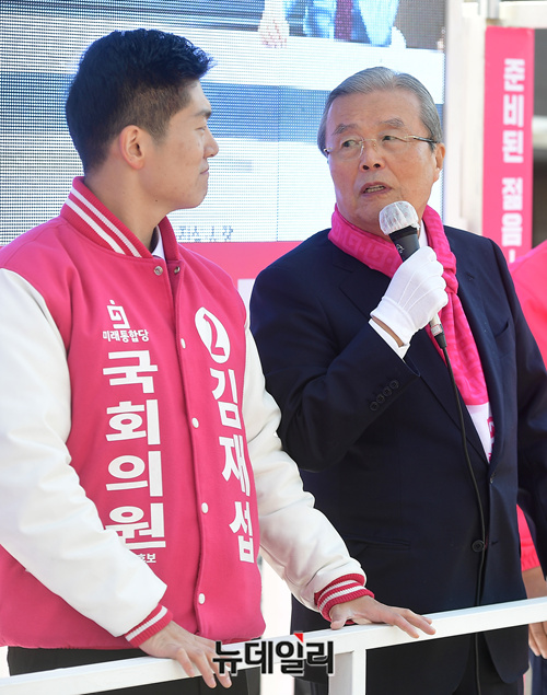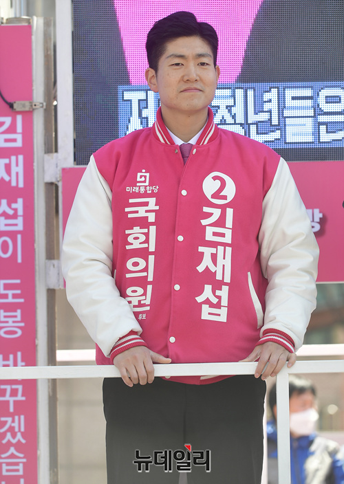 김재섭 미래통합당 서울 도봉갑 국회의원 후보가 9일 오전 서울 도봉구 쌍문역 인근에서 열린 합동유세에 참석해 자리하고 있다. 이날 도봉구 합동유세에는 김종인 총괄선대위원장이 나서 후보들의 지지를 호소했다.