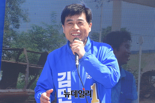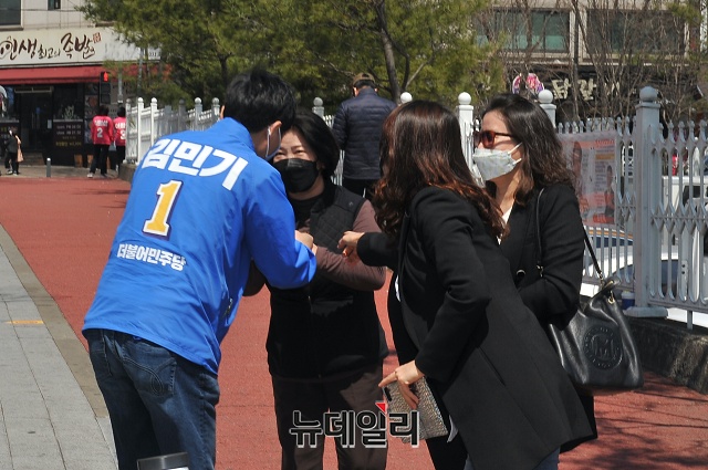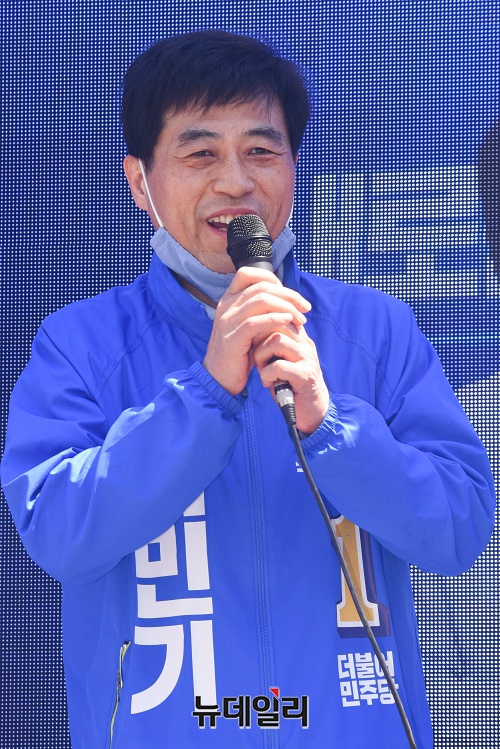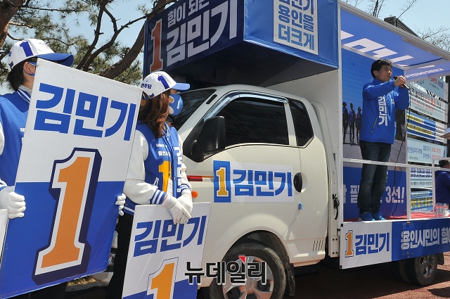 김민기 더불어민주당 경기 용인을 후보가 9일 오후 경기 용인시 기흥구청 앞에서 인사말을 하고 있다. (경기 용인=권창회 기자)