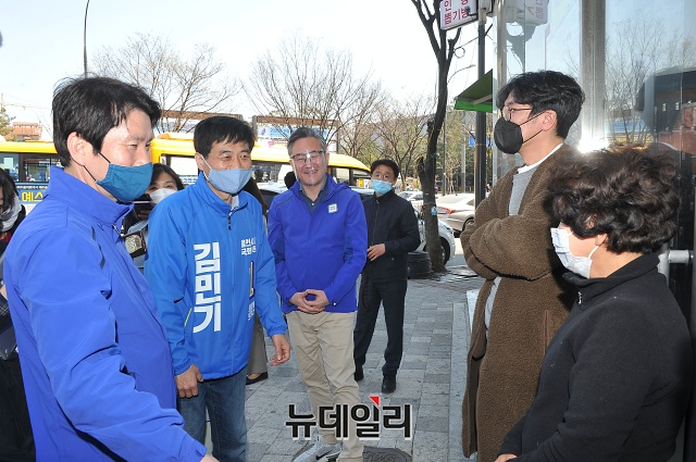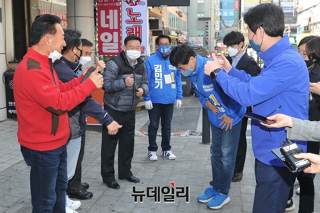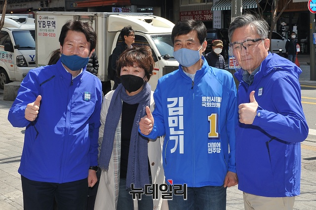 이인영 더불어민주당 공동선대위원장, 표창원 의원, 김민기 용인을 후보가 9일 오후 경기 용인시 기흥구청 주변에서 선거유세를 하고 있다. (경기 용인=권창회 기자)