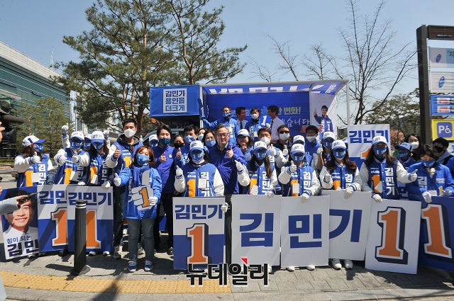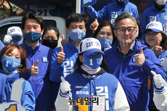 이인영 더불어민주당 공동선대위원장, 표창원 의원, 김민기 용인을 후보가 9일 오후 경기 용인시 기흥구청 주변에서 유세원들과 기념촬영을 하고 있다. (경기 용인=권창회 기자)