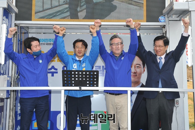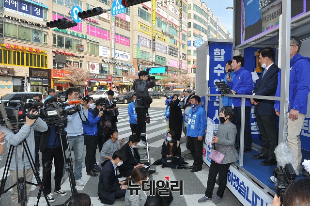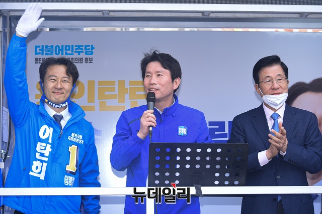 이인영 더불어민주당 공동선대위원장이 9일 오후 경기 용인시 죽전누리에뜰 사거리에서 이탄희 용인정 후보, 표창원 의원, 신경민 의원과 유세차량에 올라 지지호소를 하고 있다. (경기 용인=권창회 기자)