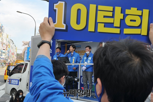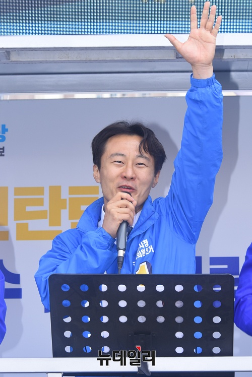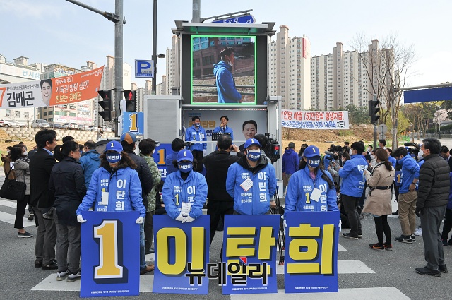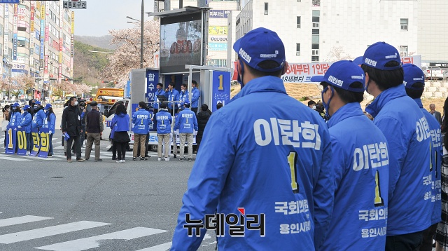 이탄희 더불어민주당 경기 용인정 후보가 9일 오후 경기 용인시 죽전누리에뜰 사거리에서 지지호소를 하고 있다. (경기 용인=권창회 기자)
