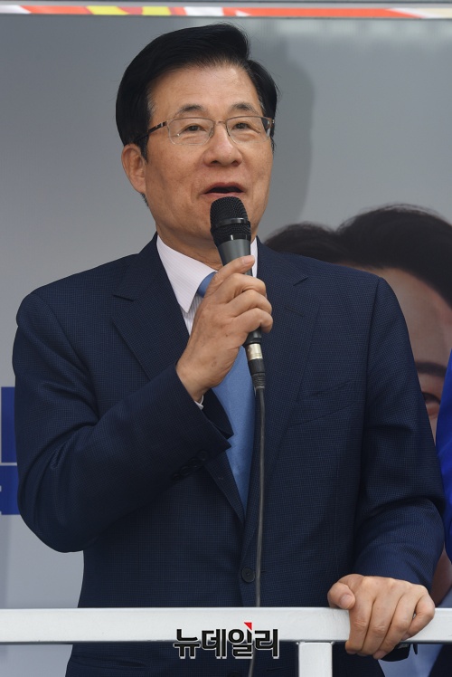 신경민 더불어민주당 의원이 9일 오후 경기 용인시 죽전누리에뜰 사거리에서 이탄희 용인정 후보, 이인영 공동선대위원장, 표창원 의원과 유세차량에 올라 이 후보의 지지호소를 하고 있다. (경기 용인=권창회 기자)