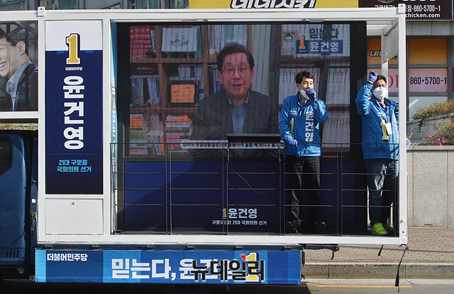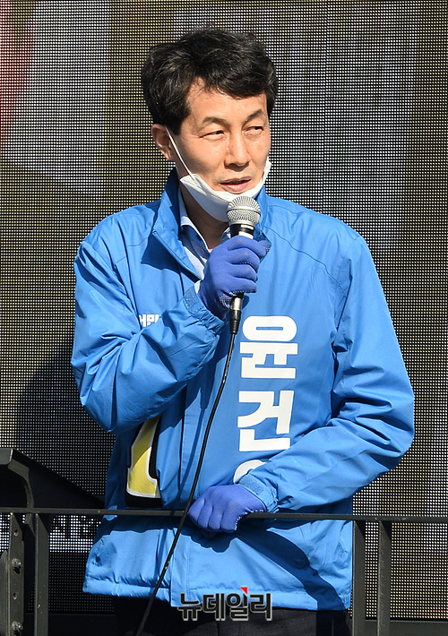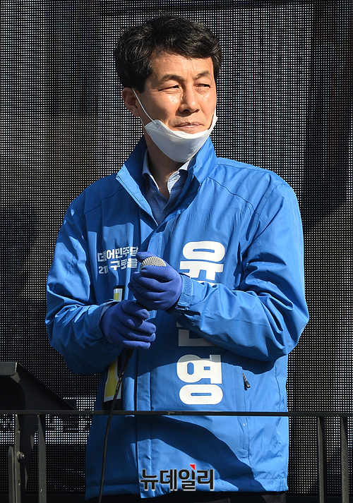 윤건영 더불어민주당 구로구을 후보가 9일 오후 서울 구로구 테크노마트 건너편에서 지지를 호소하고 있다.