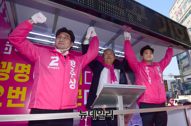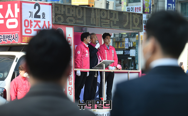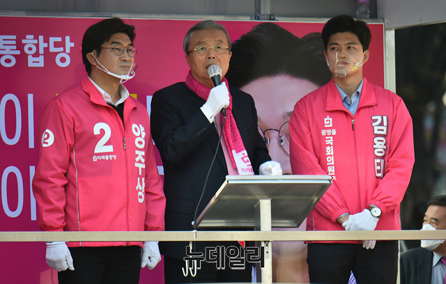 김종인 미래통합당 총괄선대위원장이 9일 오후 경기 광명시 광명사거리에서 4.15총선 광명시갑에 출마한 양주상 후보, 광명시을에 출마한 김용태 후보의 지지를 호소하고 있다.