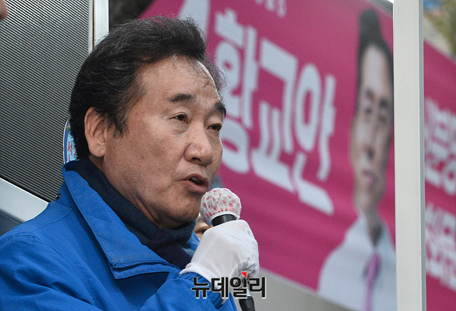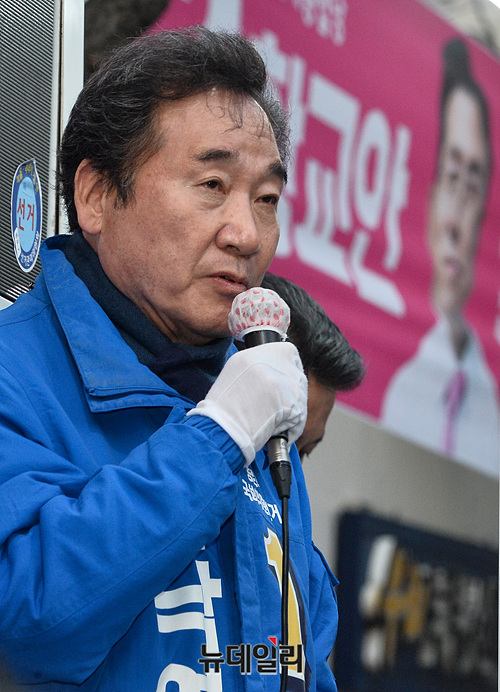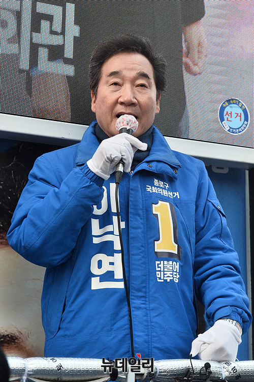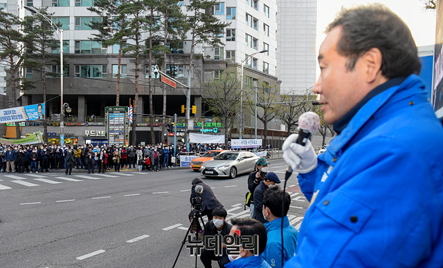 이낙연 더불어민주당 종로구 후보가 9일 오후 서울 종로구 서서울농협 사직지점 삼거리에서 지지를 호소하고 있다.