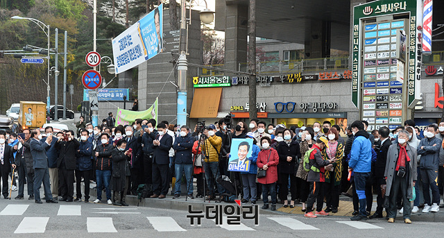 이낙연 더불어민주당 종로구 후보가 9일 오후 서울 종로구 서서울농협 사직지점 삼거리에서 지지를 호소하며 시민들에게 인사하고 있다.
