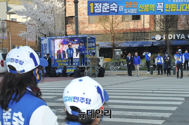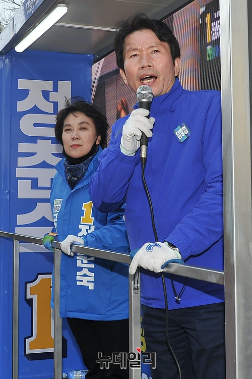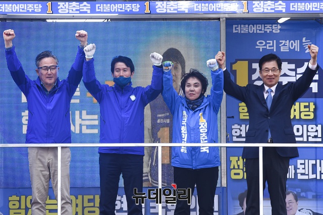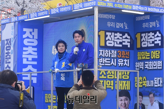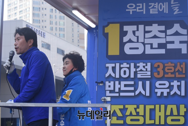 이인영 더불어민주당 공동선대위원장이 9일 오후 경기 용인시 신봉초사거리에서 정춘숙 용인병 후보와 유세차량에 올라 지지호소를 하고 있다. (경기 용인=권창회 기자)