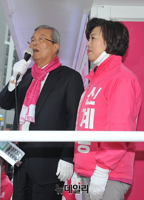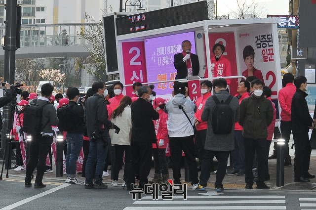 김종인 미래통합당 총괄선대위원장이 9일 오후 경기 의왕시 포일세거리 앞에서 신계용 경기 의왕과천 후보와 유세차량에 올라 지지호소를 하고 있다. (경기 의왕=권창회 기자)