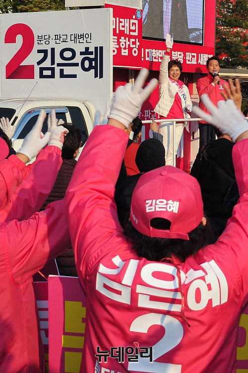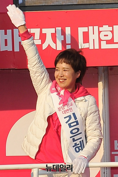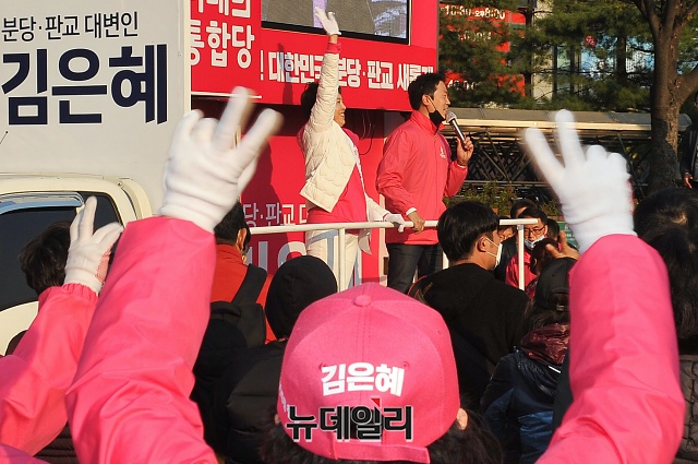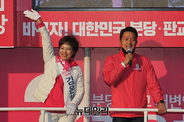 김은혜 미래통합당 성남 분당갑 후보가 9일 오후 경기 성남시 야탑역 앞에서 시민들에게 인사하고 있다. (경기 성남=권창회 기자)