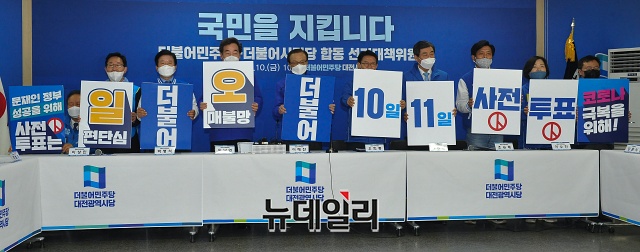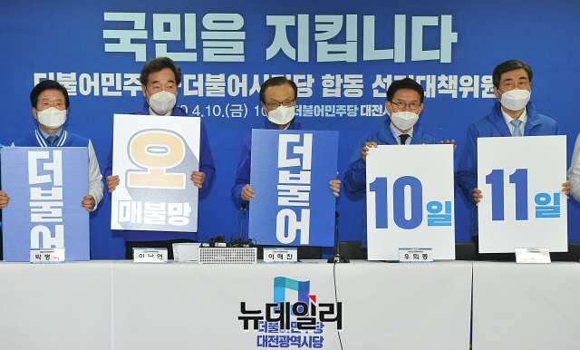 이해찬 더불어민주당 대표, 이낙연 상임공동선대위원장을 비롯한 대전 권역 후보들이 10일 오전 대전 중구 선거사무소에서 열린 더불어민주당-더불어시민당 합동 선거대책위원회에서 사전투표 퍼포먼스를 하고 있다. (대전=권창회 기자)