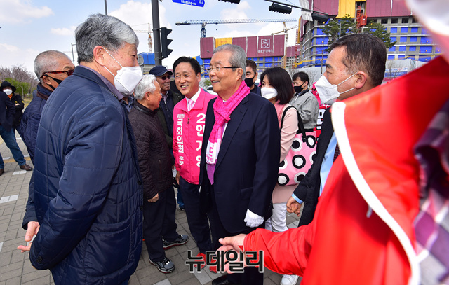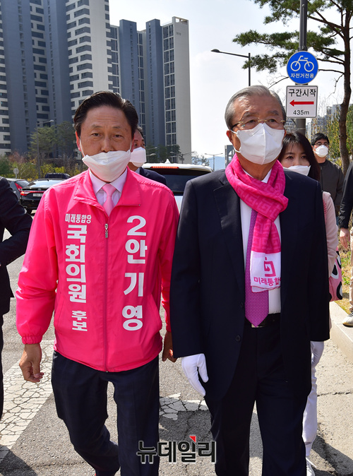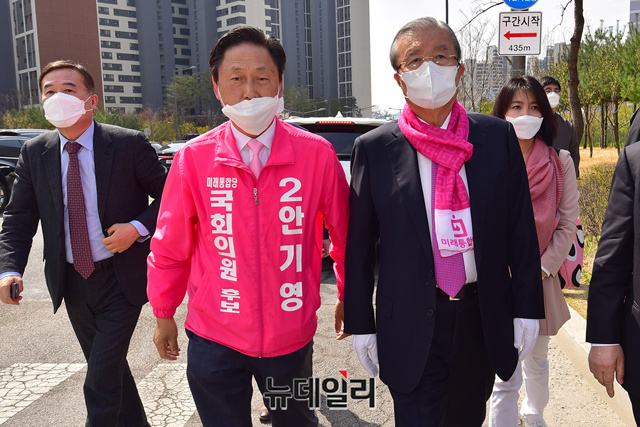 안기영 미래통합당 양주시 국회의원 후보가 10일 오전 경기 양주시 센터프라자 사거리에서 열린 유세장에 김종인 총괄선대위원장이 방문해 이동하고 있다. (경기 양주=정상윤 기자)