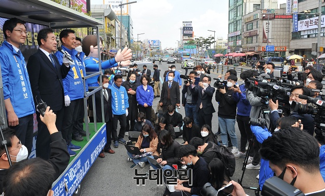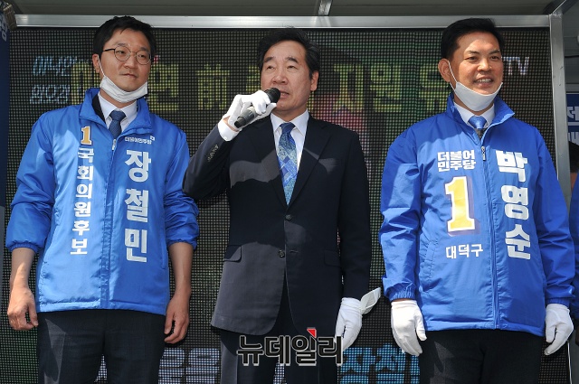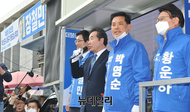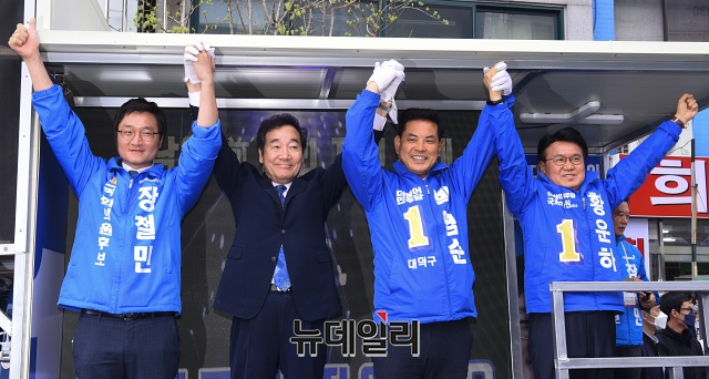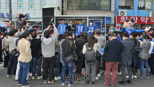 이낙연 더불어민주당 상임공동선대위원장이 10일 오전 대전 동구 중앙시장에서 황운하 대전 중구 후보, 장철민 대전 동구 후보, 박영순 대전 대덕구 후보와 유세차량에 올라 지지호소를 하고 있다. (대전=권창회 기자)