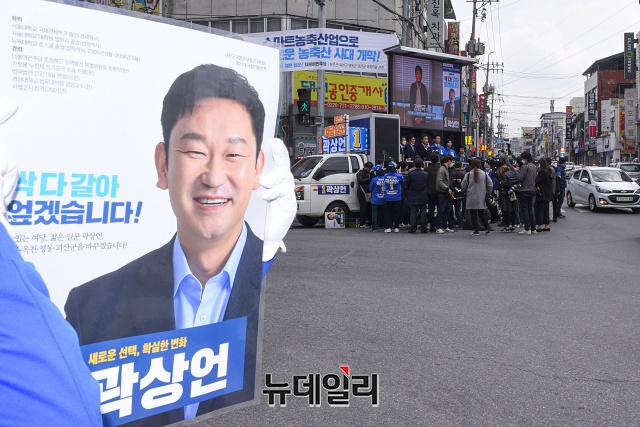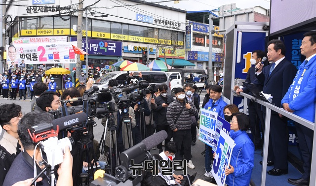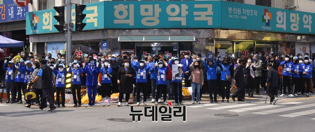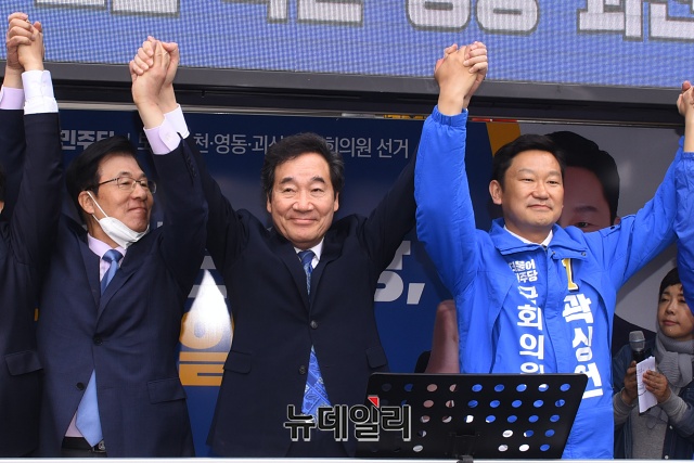 이낙연 더불어민주당 상임공동선대위원장, 곽상언 보은옥천영동괴산 후보, 신경민 의원이 10일 오전 충북 옥천군 옥천공설시장 앞에서 손을 맞잡고 기념촬영을 하고 있다. (충북 옥천=권창회 기자)