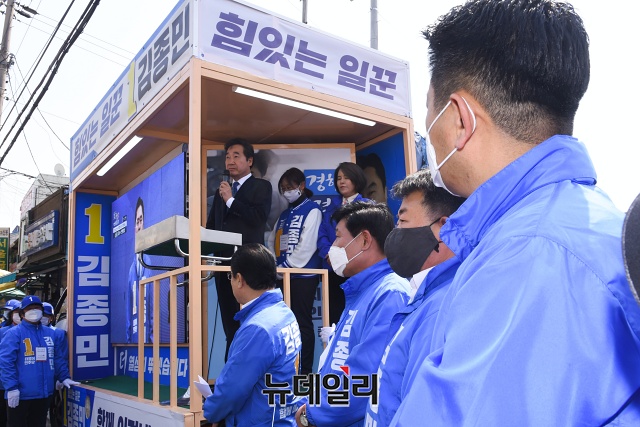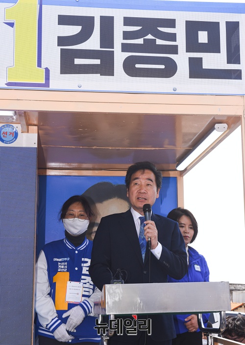 이낙연 더불어민주당 상임공동선대위원장이 10일 오후 충남 논산시 논산공설시장 주변에서 김종민 논산계룡금산 후보의 지지호소를 하고 있다. 김 후보는 방송토론회 일정으로 참석하지 못했다. (충남 논산=권창회 기자)