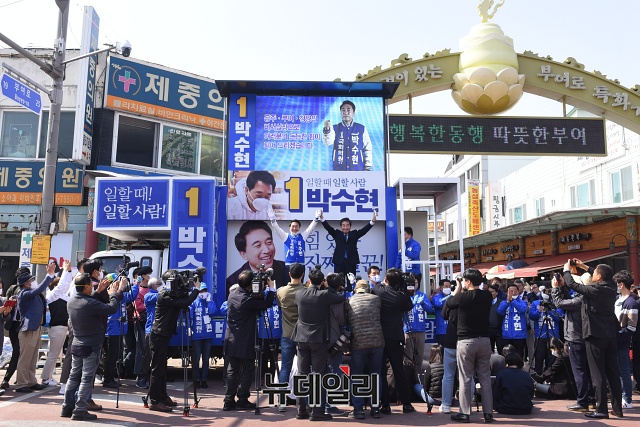 이낙연 더불어민주당 상임공동선대위원장, 박수현 공주부여청양 후보가 10일 오후 충남 부여군 부여시장 앞에서 손을 맞잡고 기념촬영을 하고 있다. (충남 부여=권창회 기자)