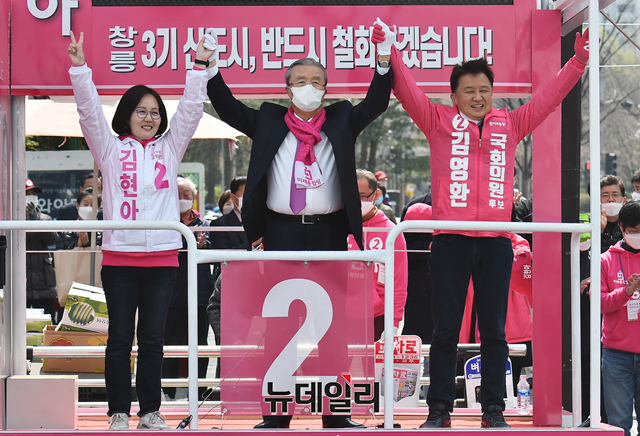 김종인 미래통합당 총괄선대위원장이 10일 오후 경기 고양시 주엽역 앞서 열린 유세에 앞서 고양병 김영환, 고양정 김현아 후보와 기념사진을 촬영하고 있다. (경기 고양=이종현 기자)