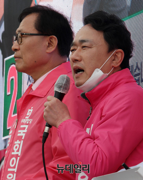 문병호 미래통합당 영등포구갑 후보자와 박용찬 영등포구을 후보자가 10일 오후 서울 영등포구 대신시장 앞에서 손을 맞잡고 지지를 호소하고 있다.