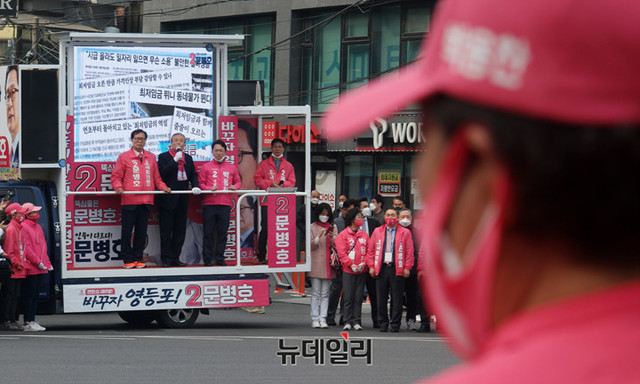 김종인 미래통합당 총괄선대위원장이 10일 오후 서울 영등포구 대신시장 앞에서 문병호 영등포구갑 후보와 박용찬 영등포구을 후보 지원유세를 하고 있다.