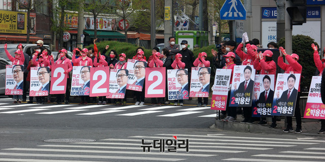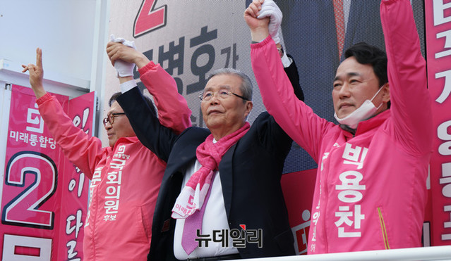김종인 미래통합당 총괄선대위원장이 10일 오후 서울 영등포구 대신시장 앞에서 문병호 영등포구갑 후보와 박용찬 영등포구을 후보 손을 맞잡고 시민들에게 인사하고 있다.