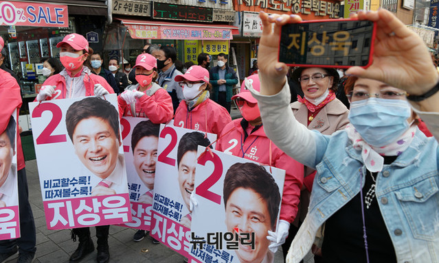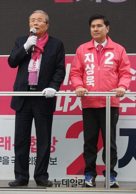 김종인 미래통합당 총괄선대위원장과 지상욱 중구성동구을 후보가 10일 오후 서울 중구 회현역 앞에서 유세차량에 올라 시민들에게 지지를 호소하고 있다.
