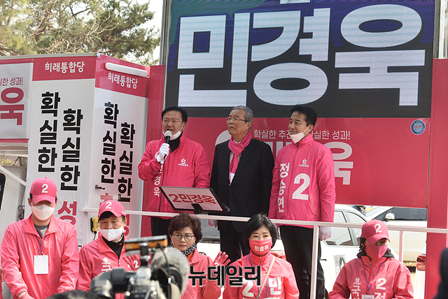 민경욱 미래통합당 인천 연수구을 후보가 11일 오전 인천 연수구 풍천장어주차장에서 지지를 호소하고 있다. (인천=박성원 기자)