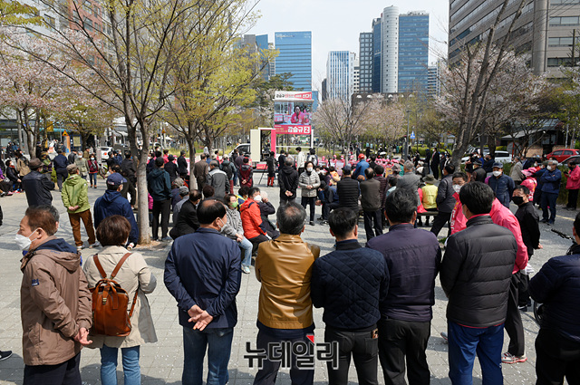 강승규 미래통합당 서울 마포구갑 후보가 11일 오후 서울 마포구 경의선 숲길공원에서 열린 숲길 핑크데이트에서 시민들에게 지지호소를 하고 있다.