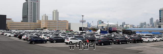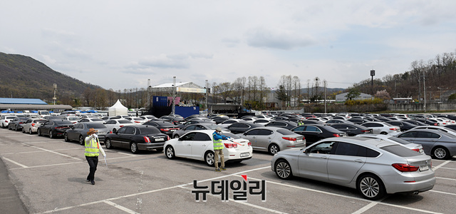 부활절인 12일 오후 온누리교회 신도들이 '코로나19(중국 우한 폐렴)' 예방을 위해 교회가 아닌 서울 서초구의 한 대형 주차장에서 '드라이브 인 워십(Drive in worship)'을 하고 있다.'드라이브 인 워십'은 라디오 주파수를 맞취 차 안에서 예배하는 방식이다.이날 온누리교회는 교적 확인, 발열 체크 등을 거쳐 주차장에 들어올 수 있도록 했다. '드라이브 인 워십' 중에도 마스크 착용을 권고하고, 차량 간 거리를 한 칸씩 띄워 예배를 진행했다.온누리교회는 오전 9시부터 진행된 1부 예배를 시작으로 5부 예배까지 '드라이브 인 워십'과 온라인예배로 진행했다.교회 관계자에 따르면 이날 예배의 부활주일 감사헌금은 어려운 시장경제와 소상공인들을 살리기 위해 사용된다고 밝혔다.