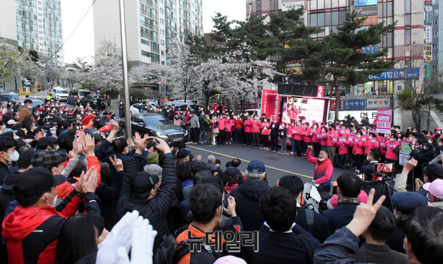 황교안 미래통합당 종로구 후보가 12일 오후 서울 종로구 무악현대프라자 앞에서 시민들에게 지지를 호소하는 가운데 시민들이 박수를 치고 있다.
