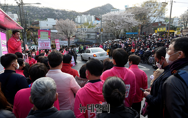 원유철 미래한국당 대표가 12일 오후 서울 종로구 무악현대프라자 앞에서 시민들에게 지지를 호소하고 있다.