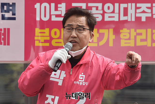 박진 미래통합당 강남을 후보가 12일 오후 서울 강남구 수서역사거리에서 지지호소를 하고 있다.