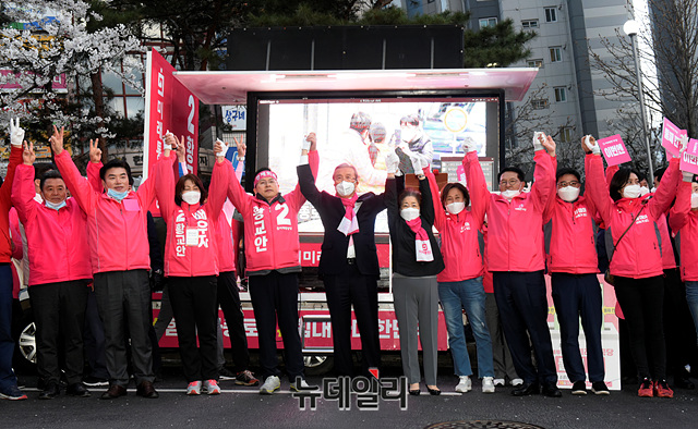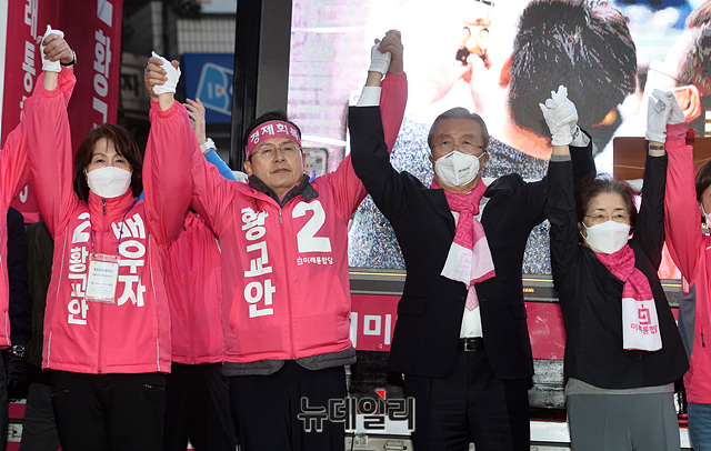 김종인 미래통합당 총괄선대위원장, 황교안 종로구 후보 등 참석자들이 12일 오후 서울 종로구 무악현대프라자 앞에서 손을 맞잡고 황 후보의 지지를 호소하고 있다.