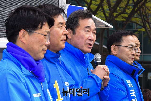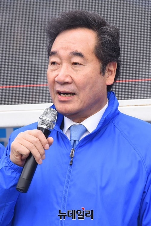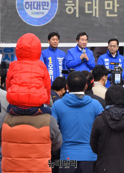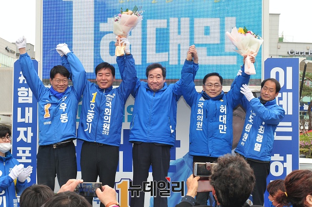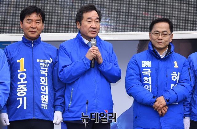 이낙연 더불어민주당 상임공동선대위원장이 13일 오전 경북 포항시청 앞에서 오중기 포항북구 후보, 허대만 포항남구울릉군 후보와 유세차량에 올라 지지호소를 하고 있다. (경북 포항=권창회 기자)