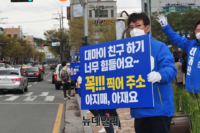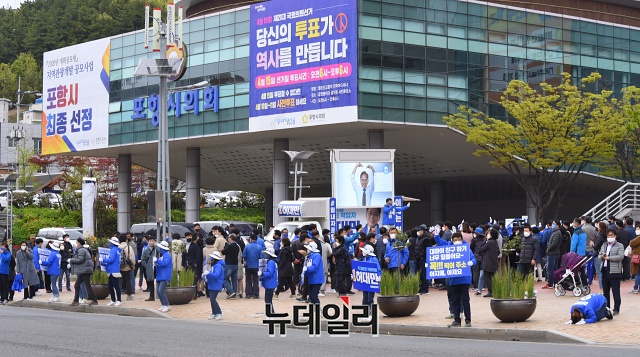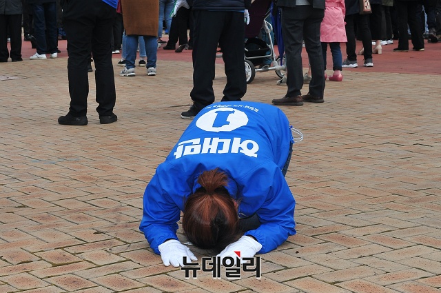 허대만 더불어민주당 포항남구울릉군 후보 선거유세원이 13일 오전 경북 포항시청 앞에서 시민들에게 절을 하고 있다. (경북 포항=권창회 기자)