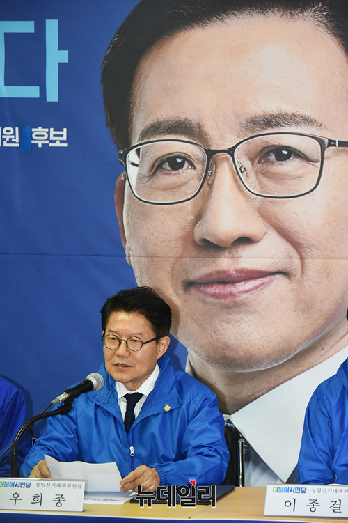 우희종 더불어시민당 상임선대위원장이 13일 오전 서울 용산구 강태웅 후보자 선거사무소에서 열린 더불어민주당·더불어시민당 합동 선거대책위원회에 참석해 모두발언을 하고 있다.