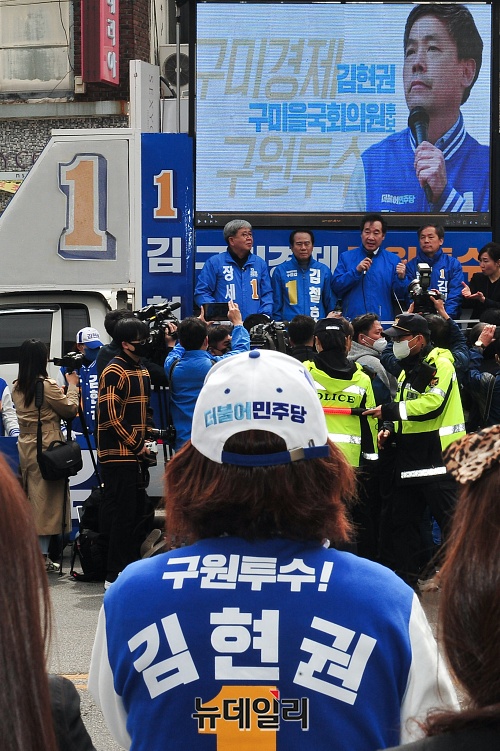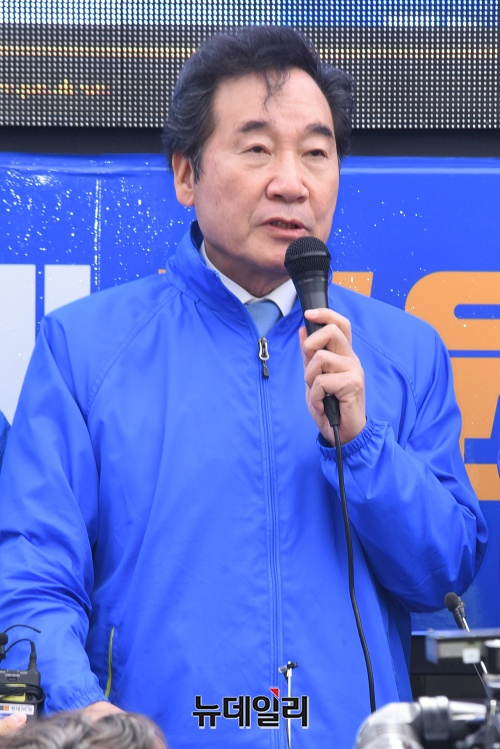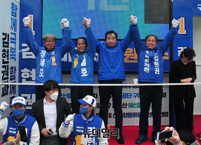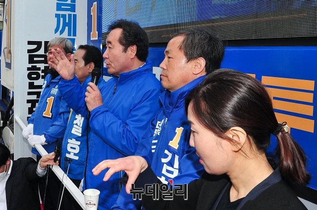 이낙연 더불어민주당 상임공동선대위원장이 13일 오전 경북 구미시 인동파출소 앞에서 김철호 구미갑 후보, 김현권 구미을 후보와 유세차량에 올라 지지호소를 하고 있다. (경북 구미=권창회 기자)