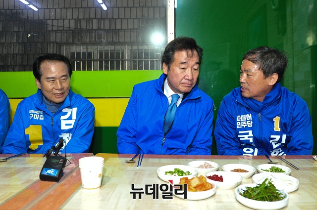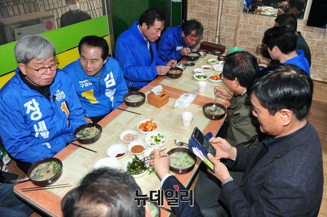 이낙연 더불어민주당 상임공동선대위원장, 김철호 구미갑 후보, 김현권 구미을 후보가 13일 오전 경북 구미시 인동시장의 한 식당에서 식사를 하고 있다. (경북 구미=권창회 기자)