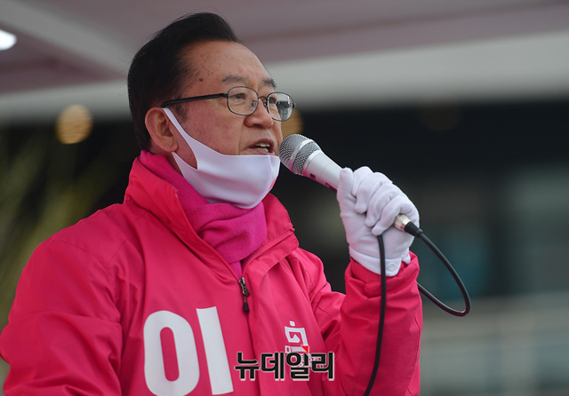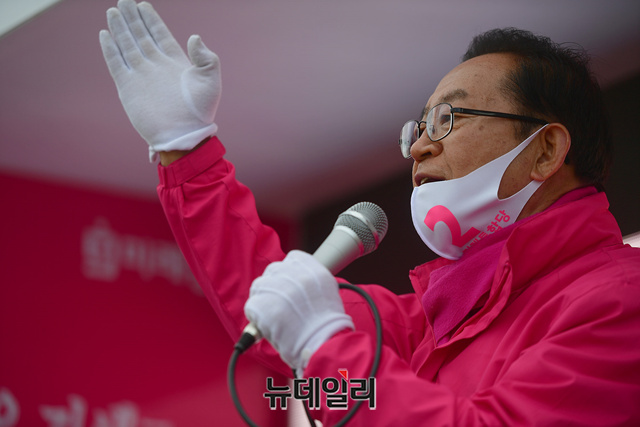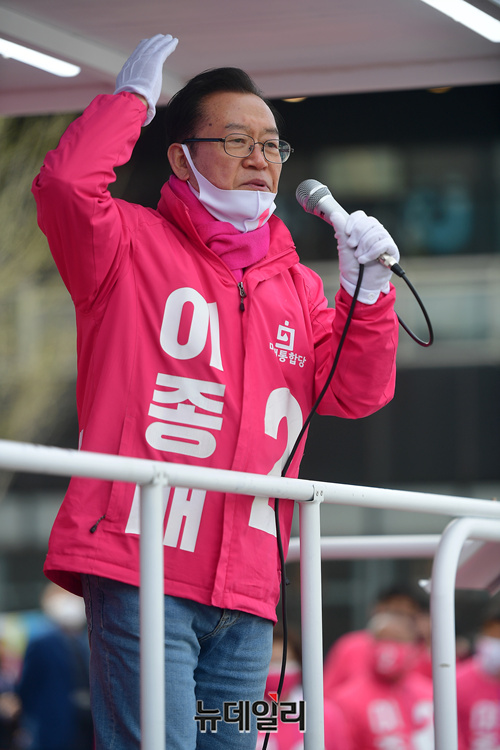 이종배 미래통합당 충주시 국회의원 후보가 13일 오전 충북 충주시 롯데마트 사거리에서 지지호소를 하고 있다. 이날 유세장에는 김종인 총괄선대위원장이 지원유세를 위해 방문했다. (충북 충주=정상윤 기자)