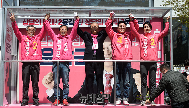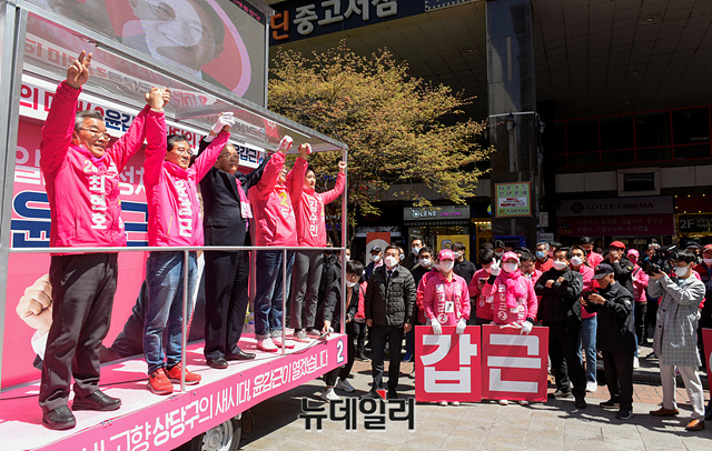 김종인 미래통합당 총괄선대위원장이 13일 오전 충북 청주 성안길에서 김수민 청주시청원구 후보, 최현호 청주시서원구 후보, 윤갑근 청주시상당구 후보, 정우택 청주시흥덕구 후보 지원유세를 하고 있다. (충북 청주=박성원 기자)