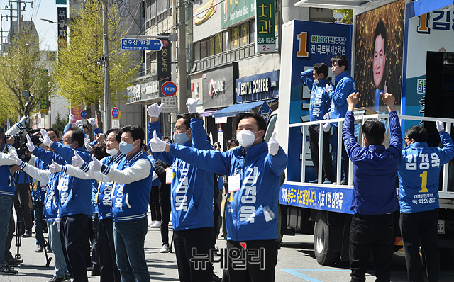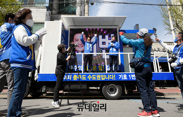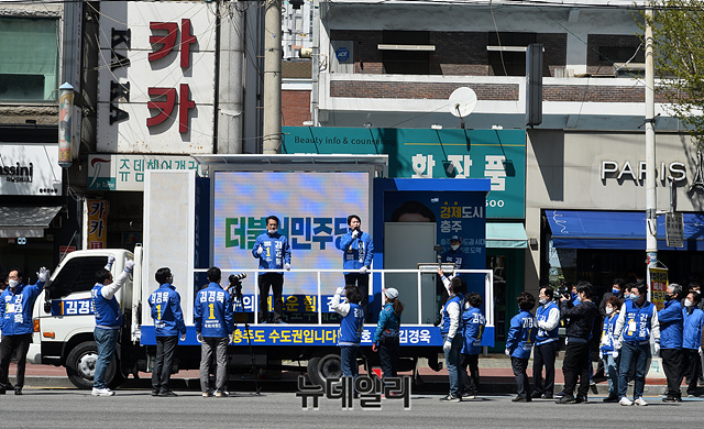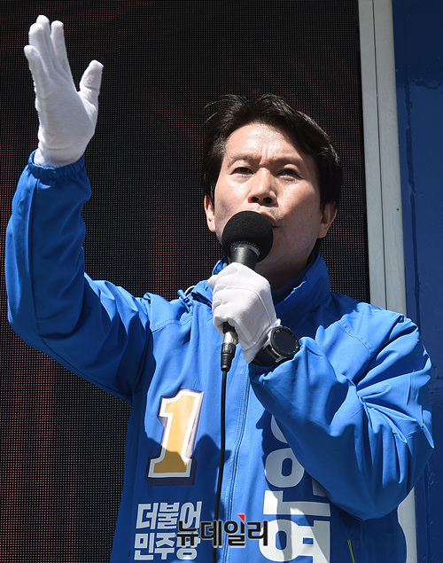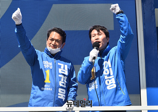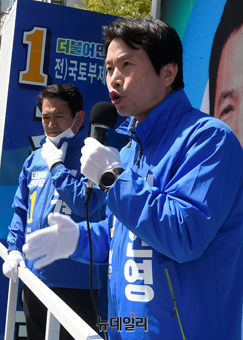 이인영 더불어민주당 원내대표가 13일 오후 충북 충주 대진빌딩앞에서 김경욱 충북 충주시 후보 지원유세를 하고 있다. (충북 충주=박성원 기자)