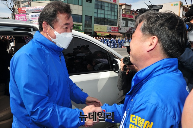 이낙연 더불어민주당 상임공동선대위원장이 13일 오후 충북 제천시 남천약국 주변에서 이후삼 제천단양 후보와 포옹을 하고 있다. (충북 제천=권창회 기자)