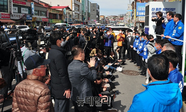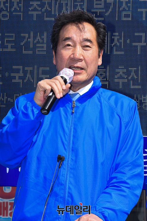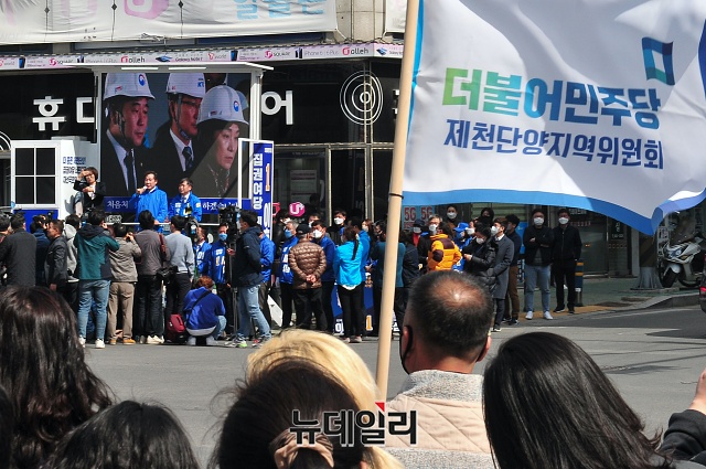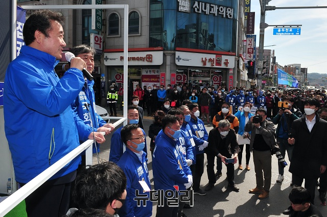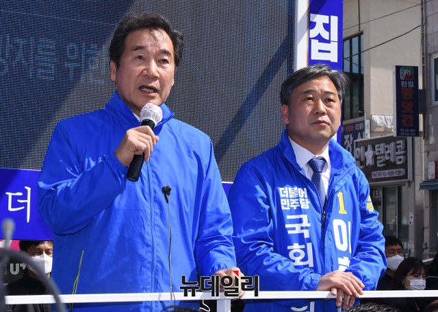 이낙연 더불어민주당 상임공동선대위원장이 13일 오후 충북 제천시 남천약국 주변에서 이후삼 제천단양 후보와 유세차량에 올라 지지호소를 하고 있다. (충북 제천=권창회 기자)