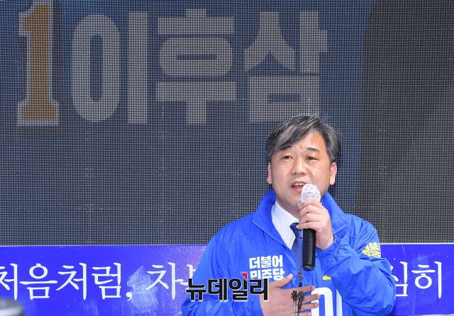 이후삼 더불어민주당 제천단양 후보가 13일 오후 충북 제천시 남천약국 주변에서 지지호소를 하고 있다. 이날 유세장에는 이낙연 공동선대위원장이 지원유세차 방문했다. (충북 제천=권창회 기자)