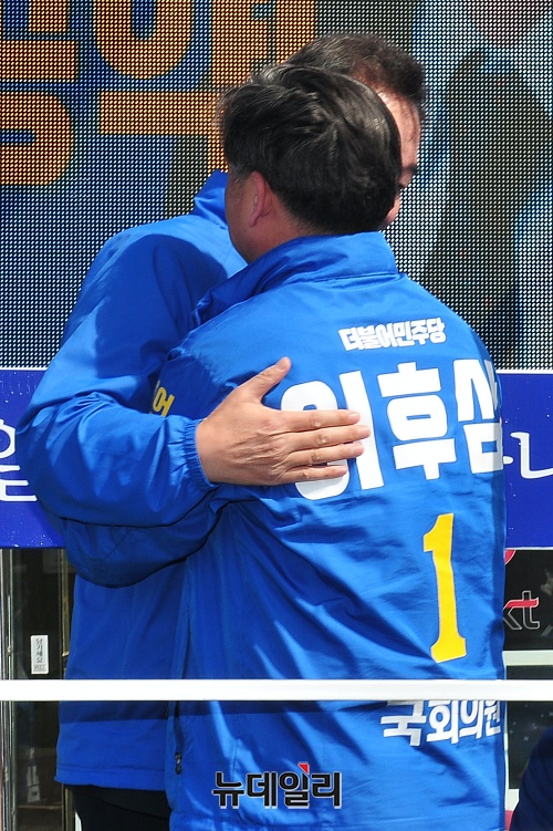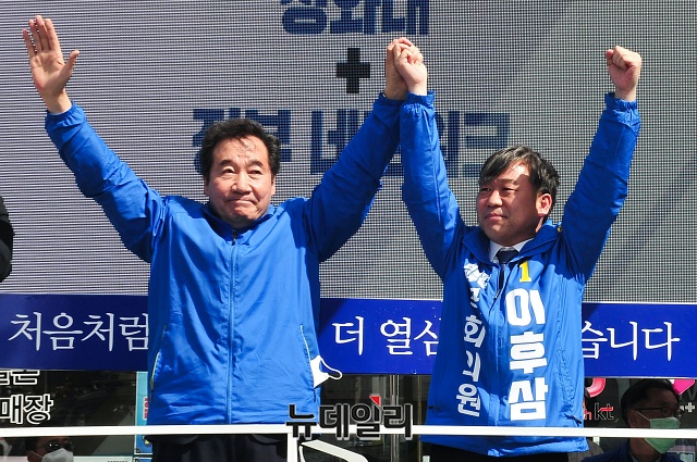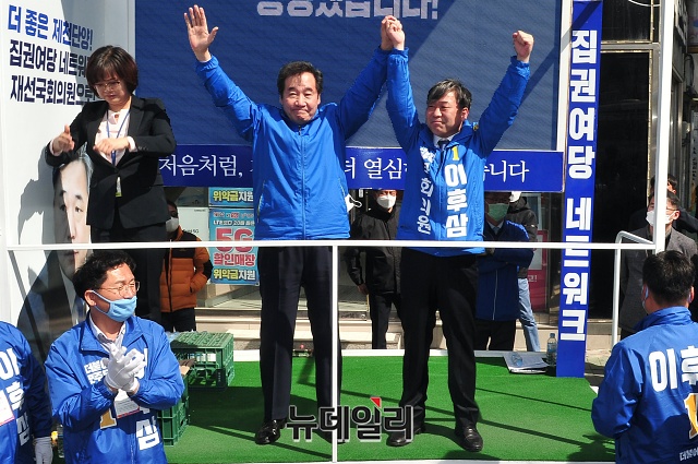 이낙연 더불어민주당 상임공동선대위원장이 13일 오후 충북 제천시 남천약국 주변에서 이후삼 제천단양 후보와 총선승리를 다짐하며 기념촬영을 하고 있다. (충북 제천=권창회 기자)