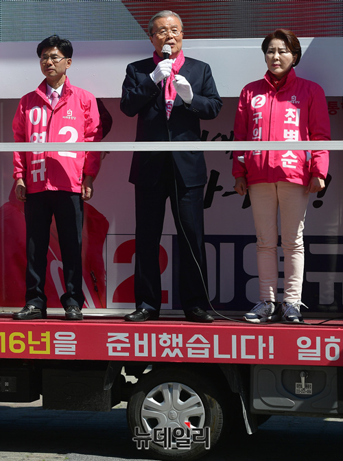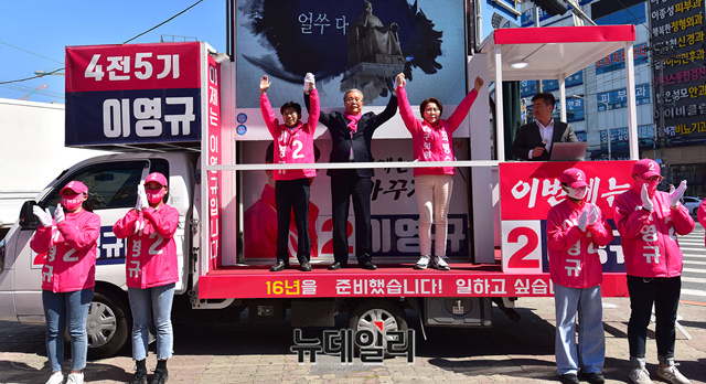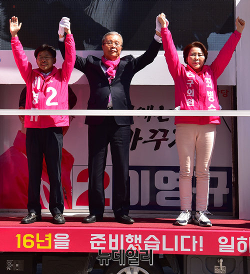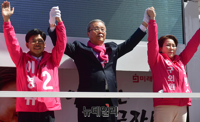 이영규 미래통합당 대전 서구갑 국회의원 후보(왼쪽부터), 김종인 총괄선대위원장, 최병순 구의원 후보가 13일 오후 대전 서구 도마사거리에서 손을 맞잡고 지지호소를 하고 있다. (대전=정상윤 기자)
