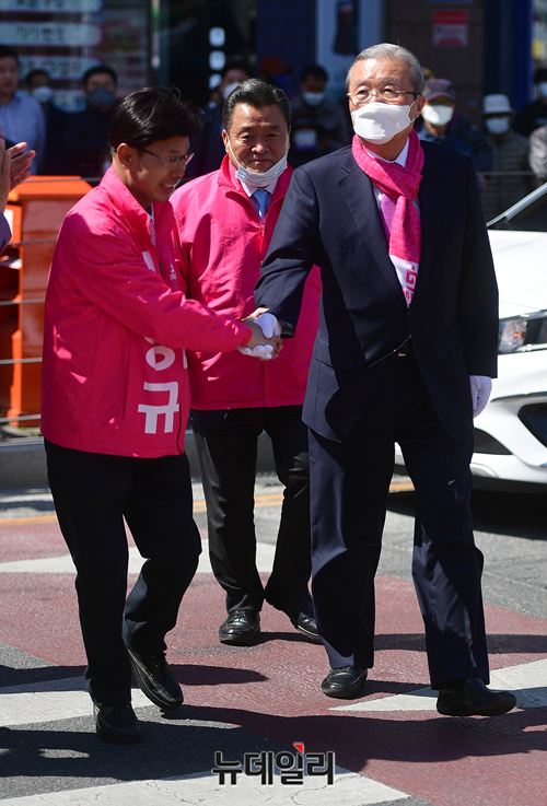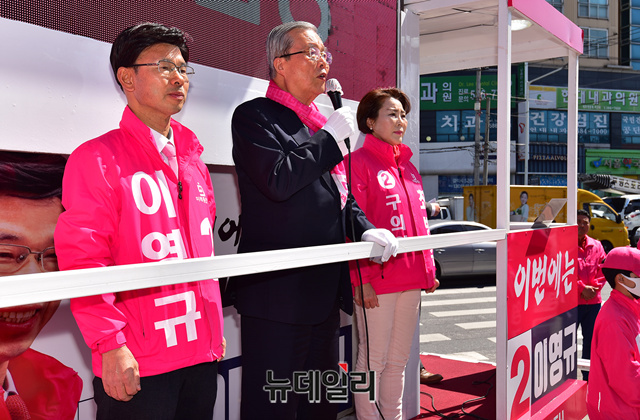 김종인 미래통합당 총괄선대위원장이 13일 오후 대전 서구 도마사거리에서 유세중인 이영규 대전 서구갑 후보를 방문해 지원유세를 하고 있다. 이날 유세장에는 구의원에 출마하는 최병순 후보도 함께 했다. (대전=정상윤 기자)