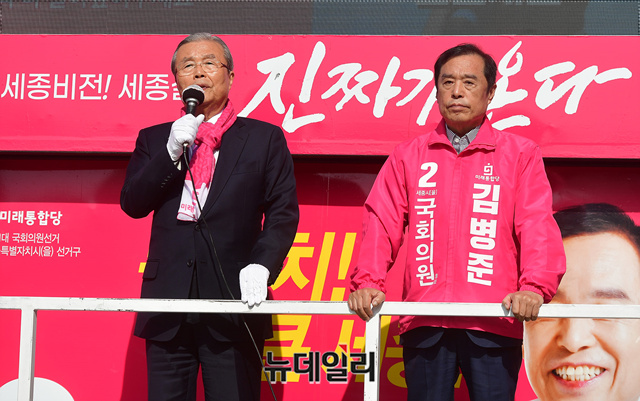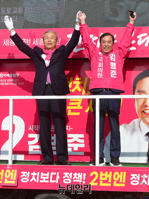 김병준 미래통합당 세종을 국회의원 후보가 13일 오후 세종시 종촌파크프라자 광장 유세장을 방문한 김종인 총괄선대위원장과 손을 맞잡고 지지를 호소하고 있다. (세종=정상윤 기자)